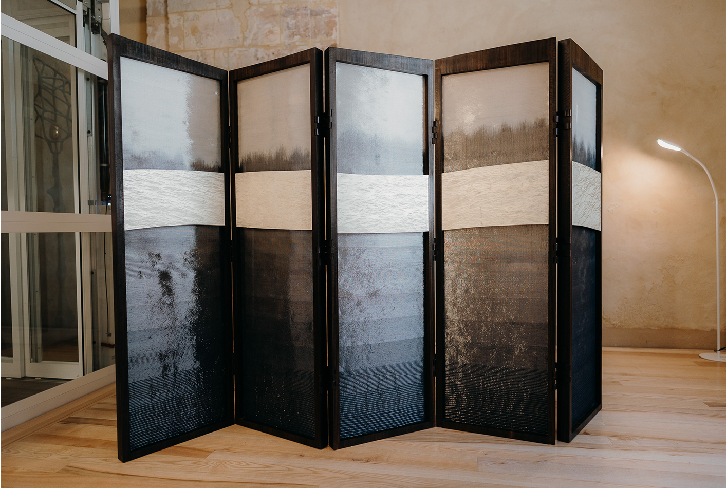 The screen will be displayed at the Journées Européennes des Métiers d’Art in Mortagne-au-Perche in April 2025. This event is dedicated to showcasing exceptional craftsmanship. Visitors will have the opportunity to experience the piece up close, observing how light transforms its appearance and how the materials interact to create a constantly changing visual effect.