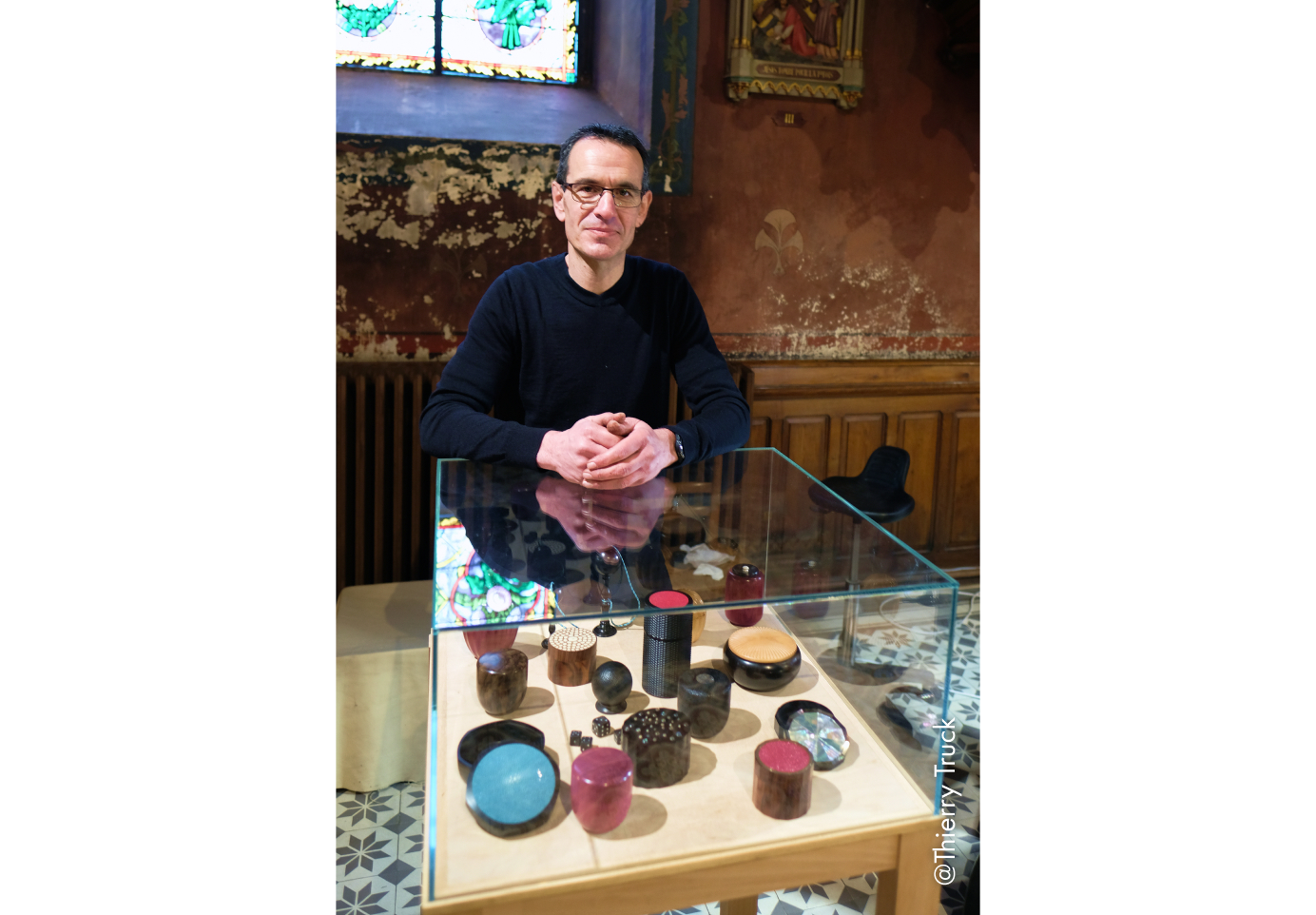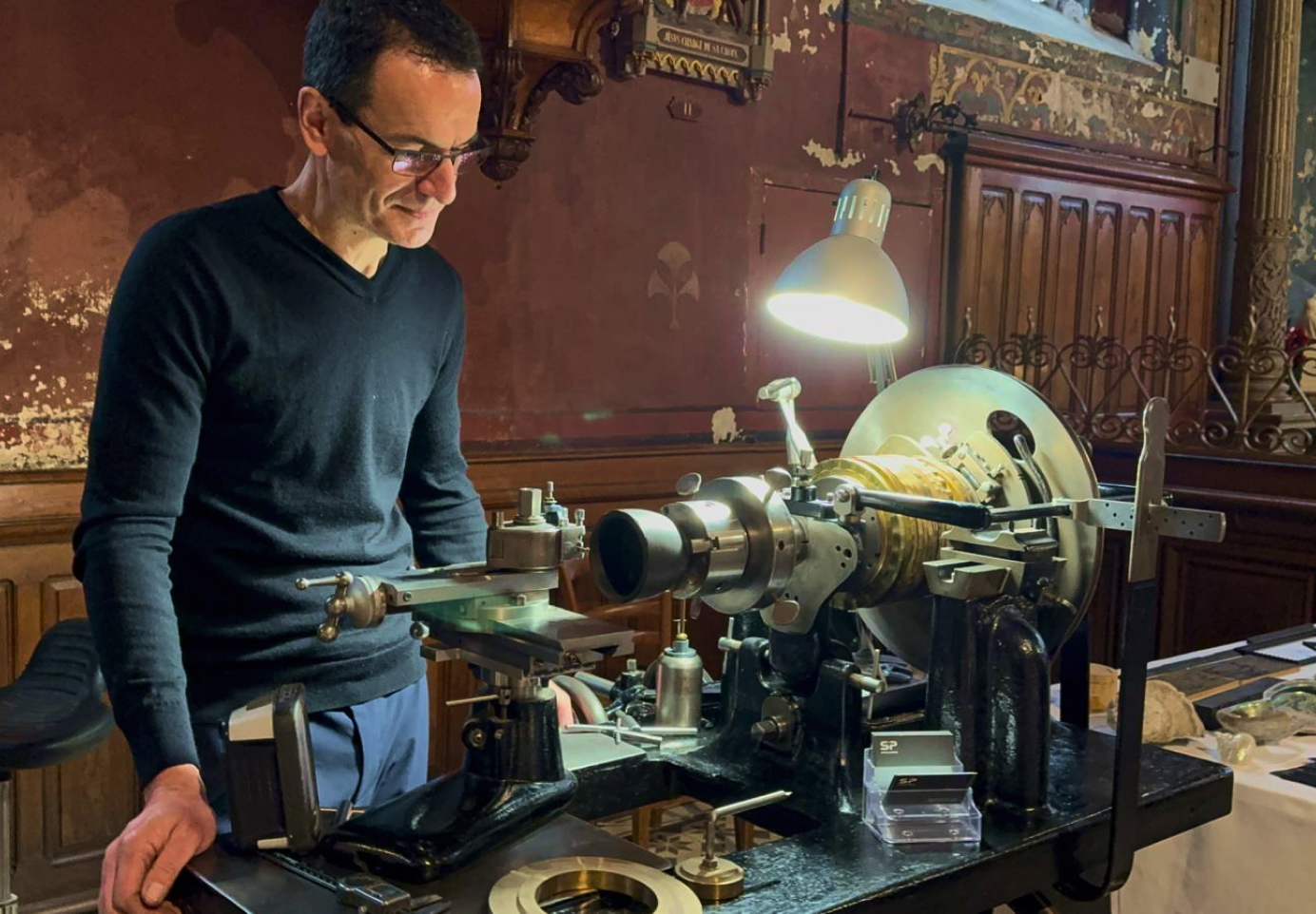 - Frédéric Hamel, a renowned cabinet maker, displayed his expertise at the Chapelle Saint-François. He showcased a vintage guilloche lathe, crafted in Switzerland in 1926, a machine intended to create geometric decoration on watch dial backs. In his current work, Frédéric uses the lathe still in its original condition to work with metal and wood.