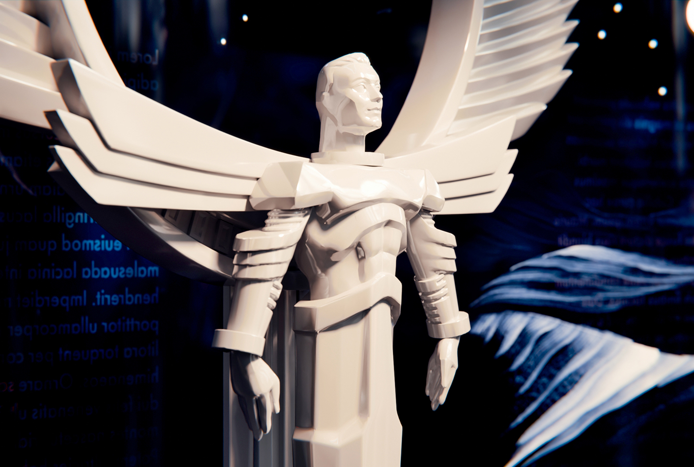 - Temple depicts a mountain citadel illuminated by a vertical energy beam.