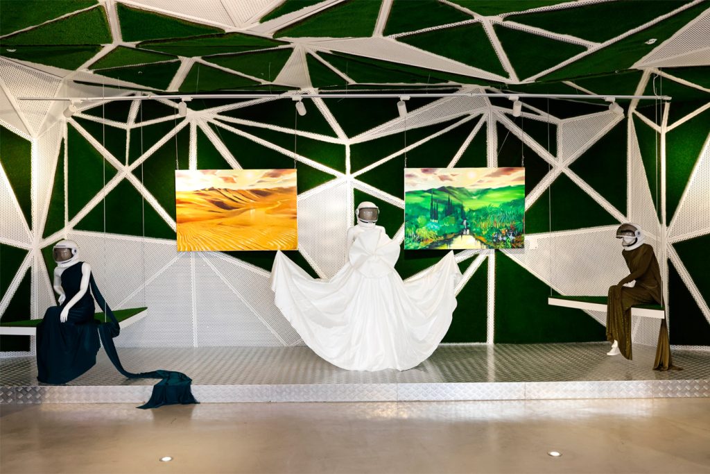 Ethereal Echoes goes beyond the conventional exhibition experience with the introduction of augmented reality (AR) scenarios for the canvases and the first — for the couture dress. This provides visitors with a one-of-a-kind interaction, allowing them to delve deeper into the narrative. Additionally, the exhibition introduces Cosmodreams Snapchat AR jewelry, a fusion of digital and physical artistry, enhancing the viewer’s engagement with the artworks.